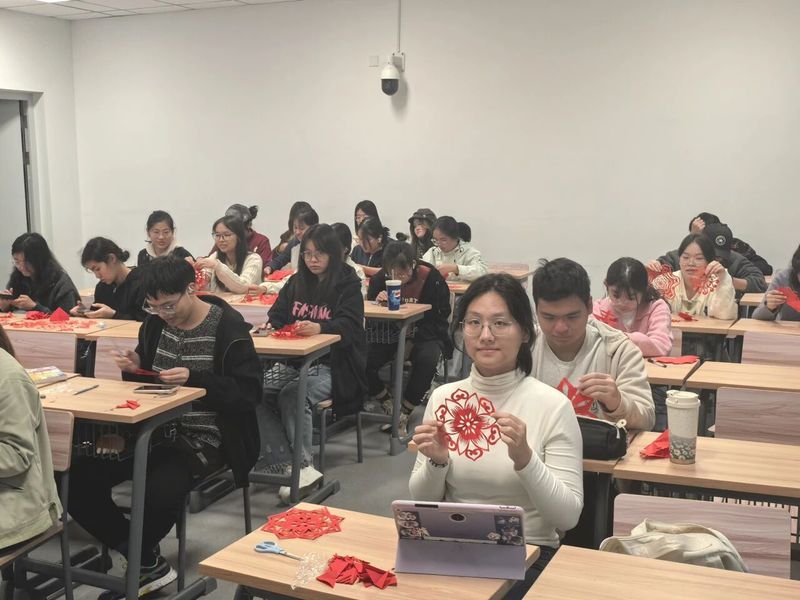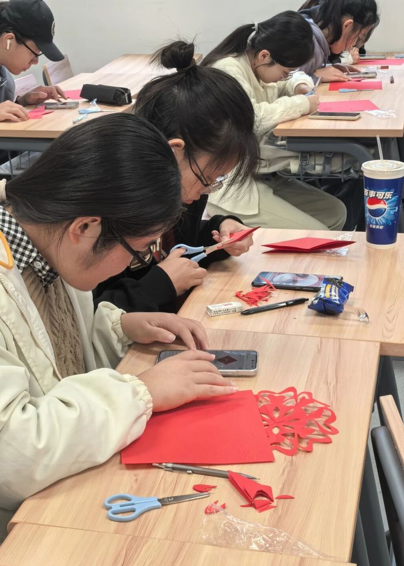 轮到最令人期待的实操环节,同学们全都跃跃欲试。红纸、剪刀、刻刀、垫板等工具一就绪,大家便依照讲解中的技巧要领动起手来。大家以剪为笔、以纸为媒,亲手裁剪心中图景,让传统技艺在指尖焕活。创作间隙,同学们还相互交流技法、分享灵感,现场洋溢着专注而热烈的氛围。